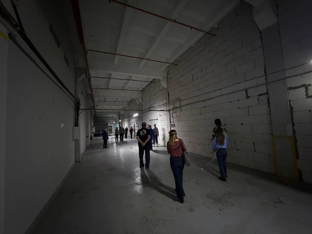 Экскурсия с закрытыми глазами проходила в здании «Нижполиграфа» — издательства в Нижнем Новгороде, занимавшего комплекс зданий, исторически известных как Дом трудолюбия имени Михаила и Любови Рукавишниковых. Переплетение коридоров, переходов, множества лестниц и разных архитектурных стилей сделало прогулку интересной. Каждое задание выполнялось в новой локации. К некоторым из них человек с повязкой на глазах должен был дойти самостоятельно, используя обозначенные ориентиры.